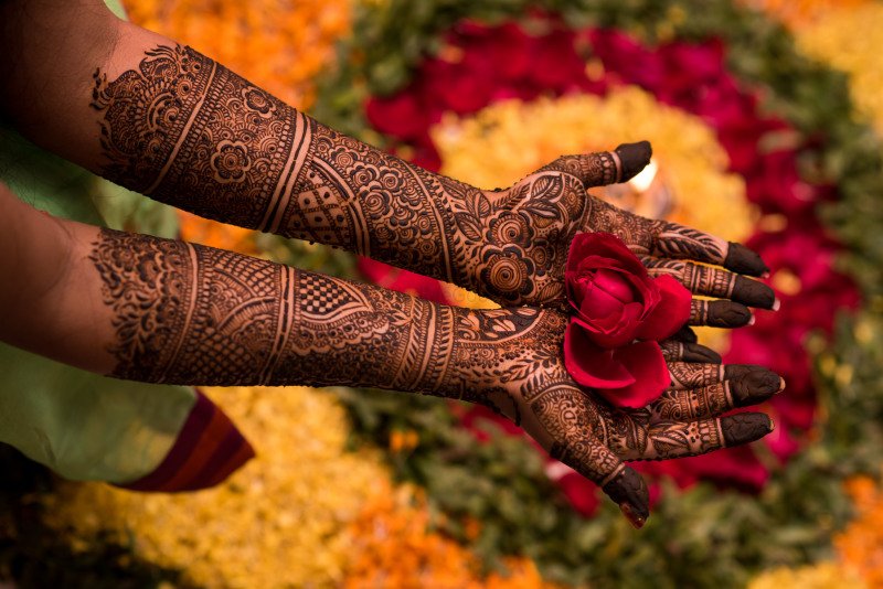 Heena or Mehndi is like a temporary tattoo that usually lasts a month and slowly fades away. There is a belief the bride who gets a dark-colored Heena will be lucky and will get a lot of love from the groom’s family.